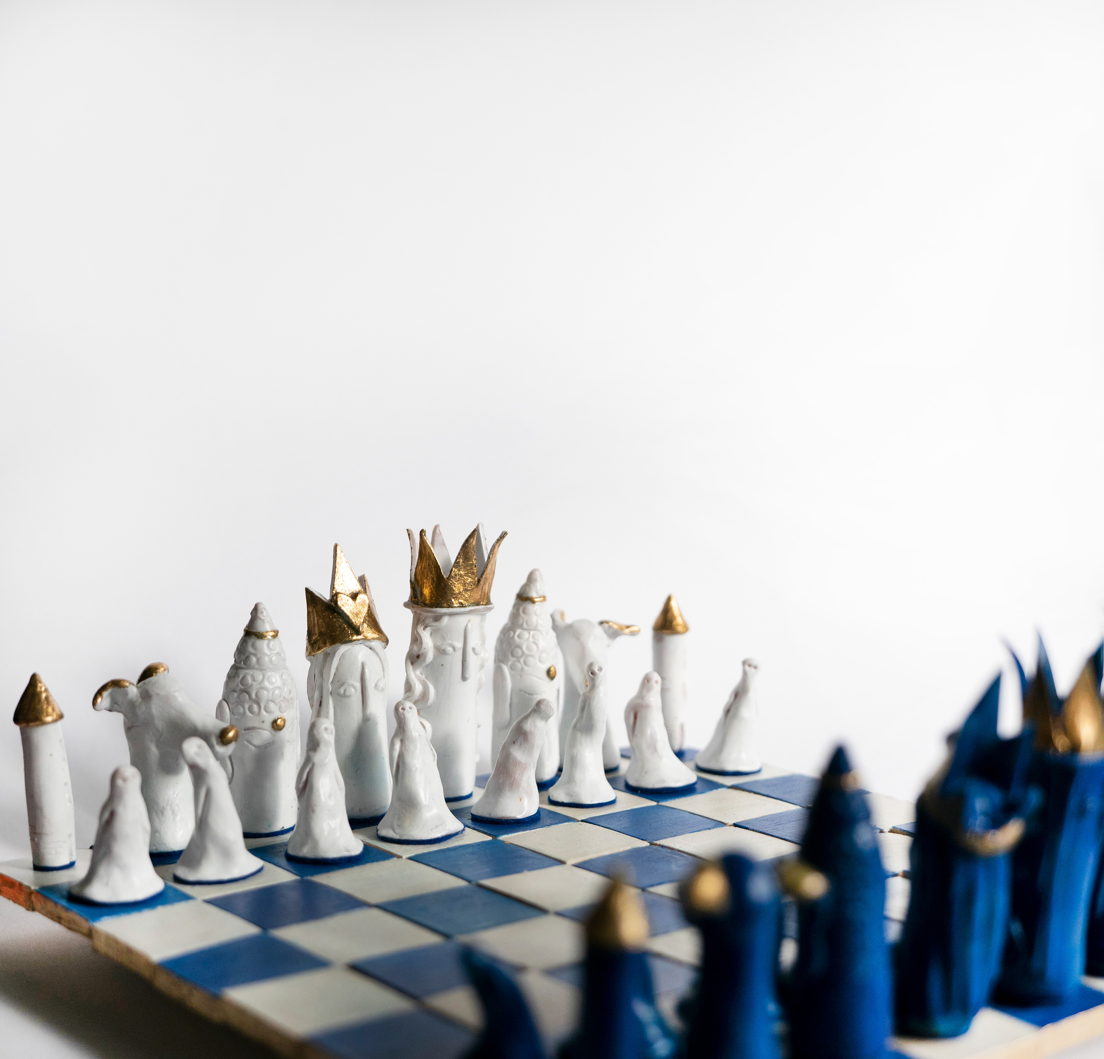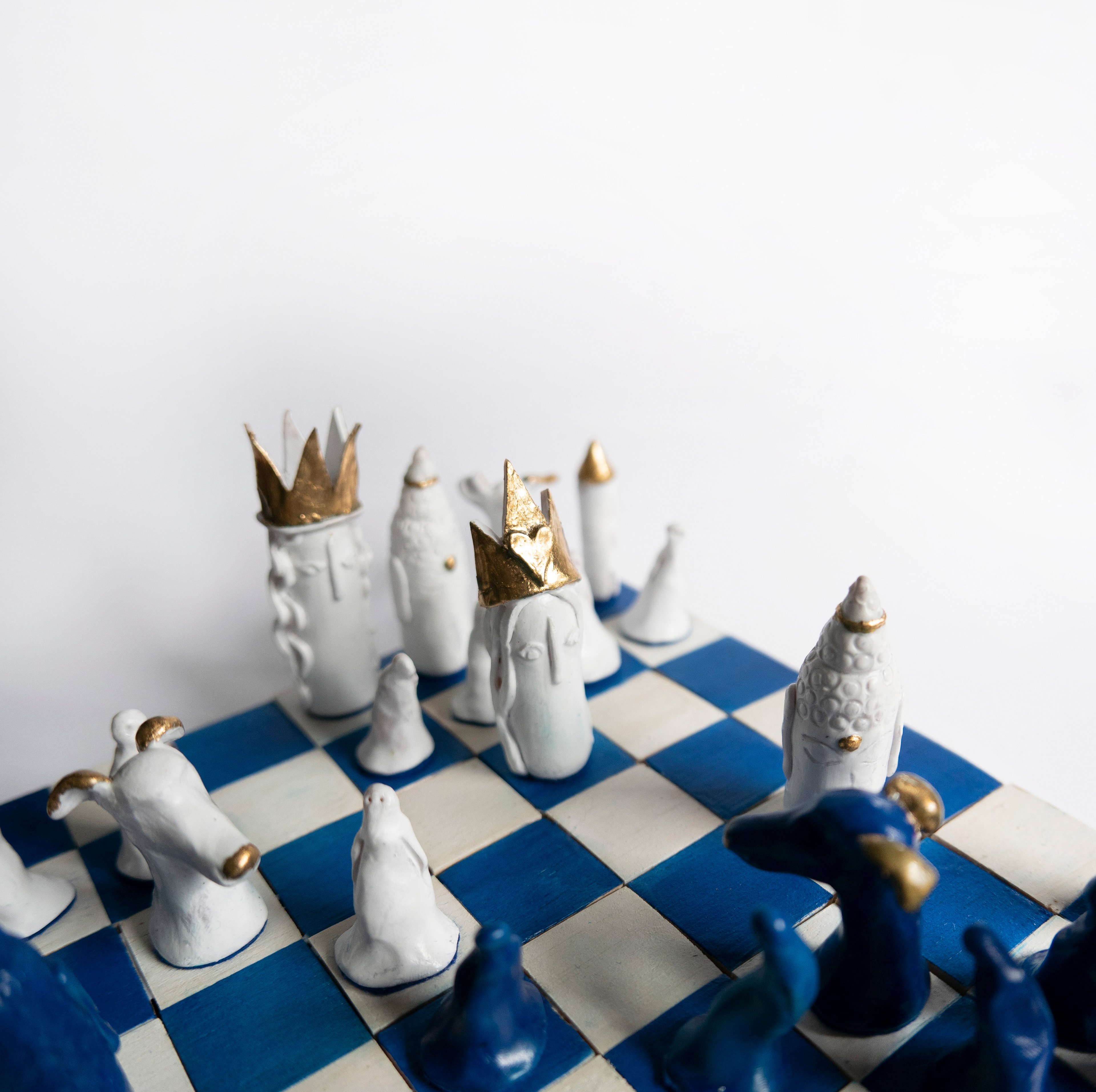 I made this customised chess set as a commission so each of the pieces correspond to a personal trait or interest of the client. Wood, Clay, Gold leaf