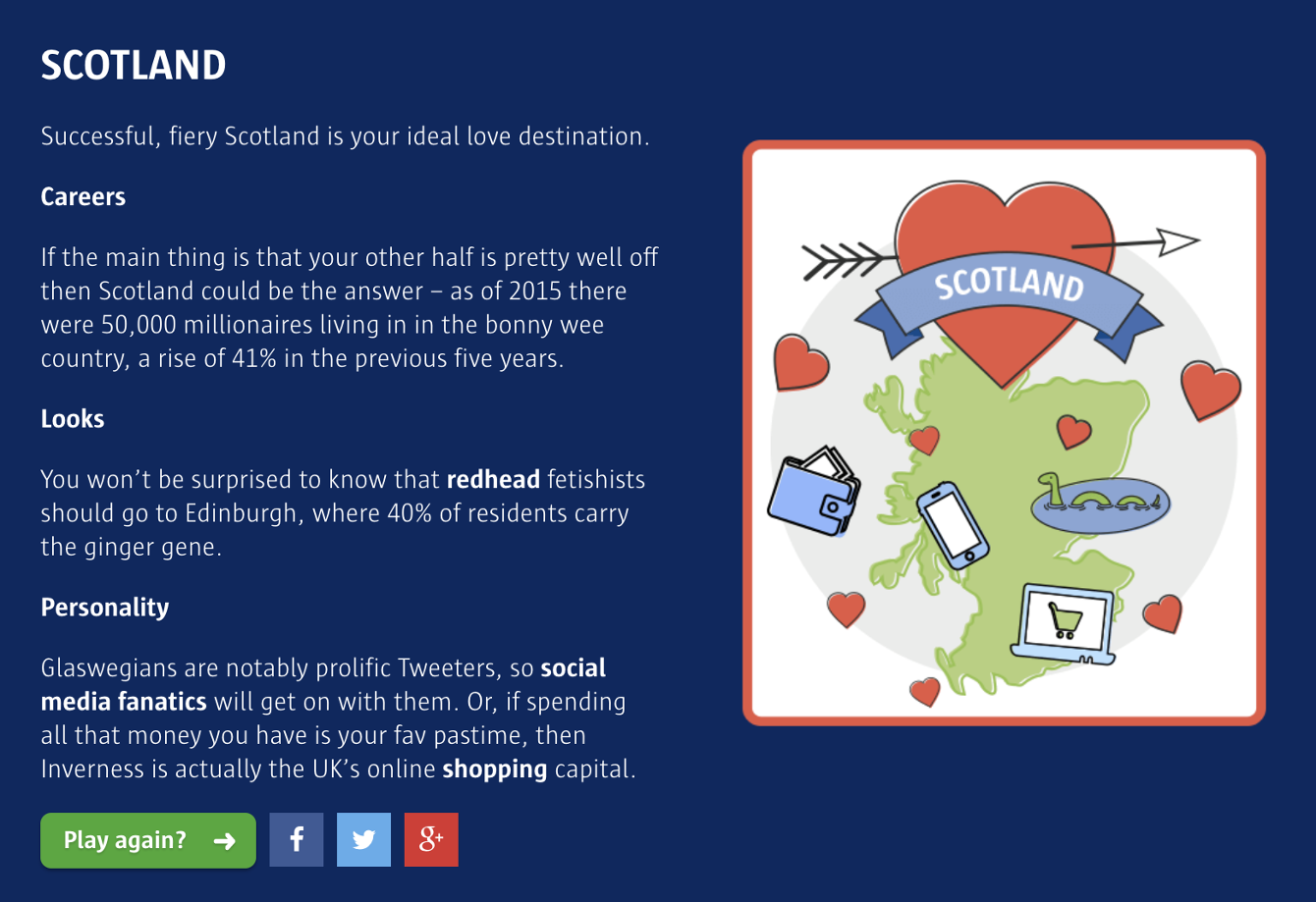 I made these infographics and icons for a quiz for Compare the Market. The quiz aimed to tell you where you were statistically most likely to find love in the UK <3
